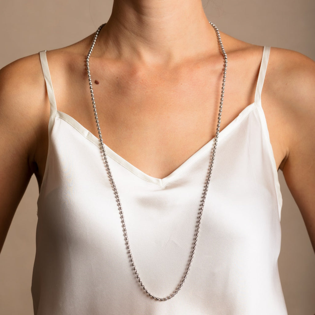 - 34-36” including a 2” extension (86-91cm). We also call it D length or Rope length. Excellent for a long look or for layering.