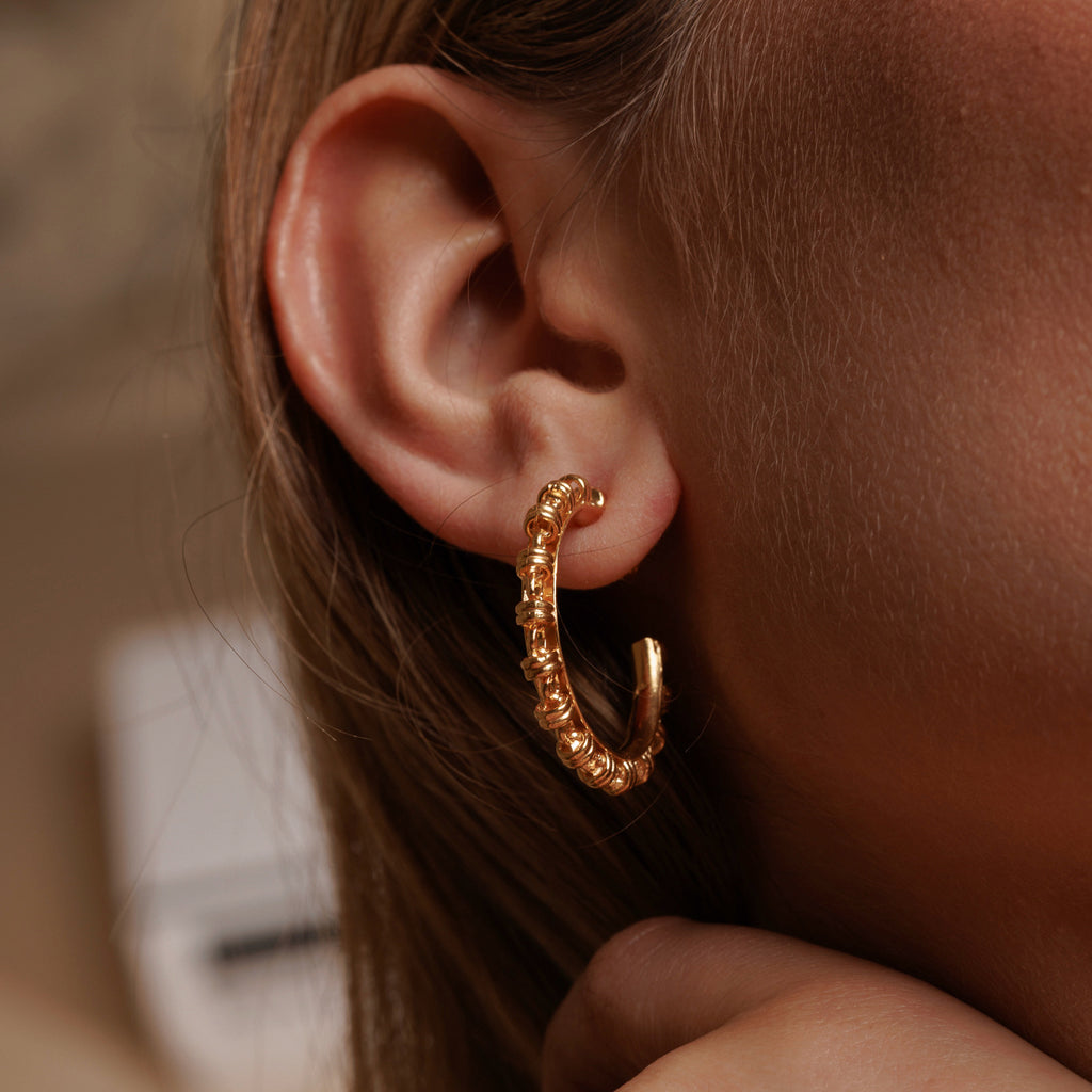 One of the most iconic DelBrenna designs goes bigger and bolder! This intricate design manages to be comfortable and versatile without giving up beauty and style. These hoops feature our Links 3mm chain, allowing you to wear them with a matching necklace for a polished look, or pair them with another DelBrenna signature chain for variety.