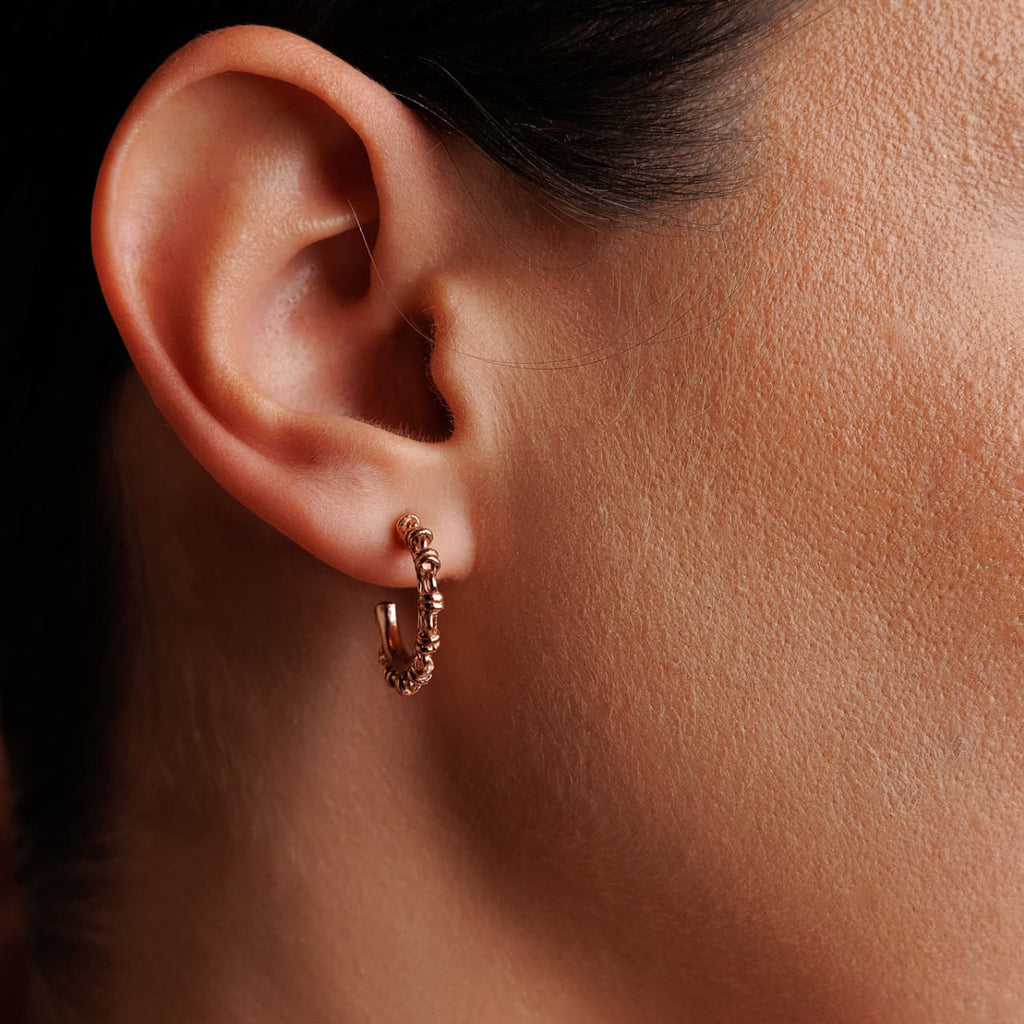 If we could only take one pair of earrings on holiday, we would take these versatile, adorable rose gold hoop earrings. Their intricate design is comfortable and light without giving up even an ounce of beauty and style.