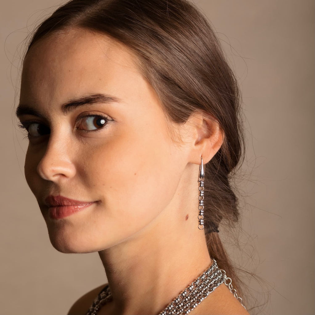 Earrings in 925 silver with DelBrenna’s Signature Rhodium Finish. 2 1/4” long including post (5.7cm). Hook closure.